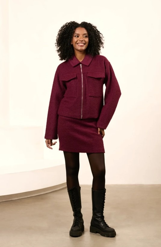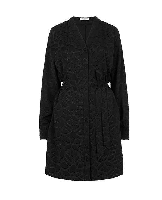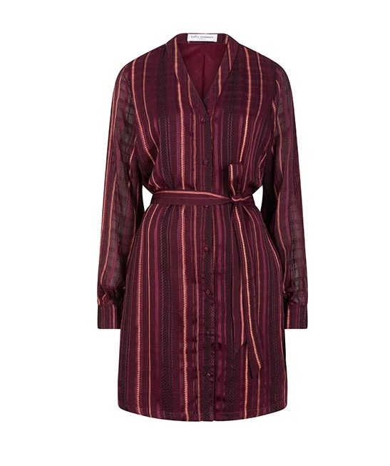 Jurk Lina is een bordeauxrode jurk met print. De jurk heeft een V-hals, afneembare riem en knoopjes bij de mouwuiteinden. De gekleurde jurk heeft knoopjes over de gehele lengte en is gemaakt van een mooie geweven stof. De jurk is qua pasvorm rechtvallend.
