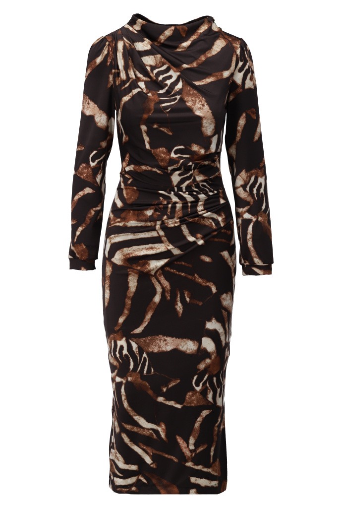 Deze jurk van K-Design is gebreid, heeft een grote print met verschillende materialen en een colkraag.