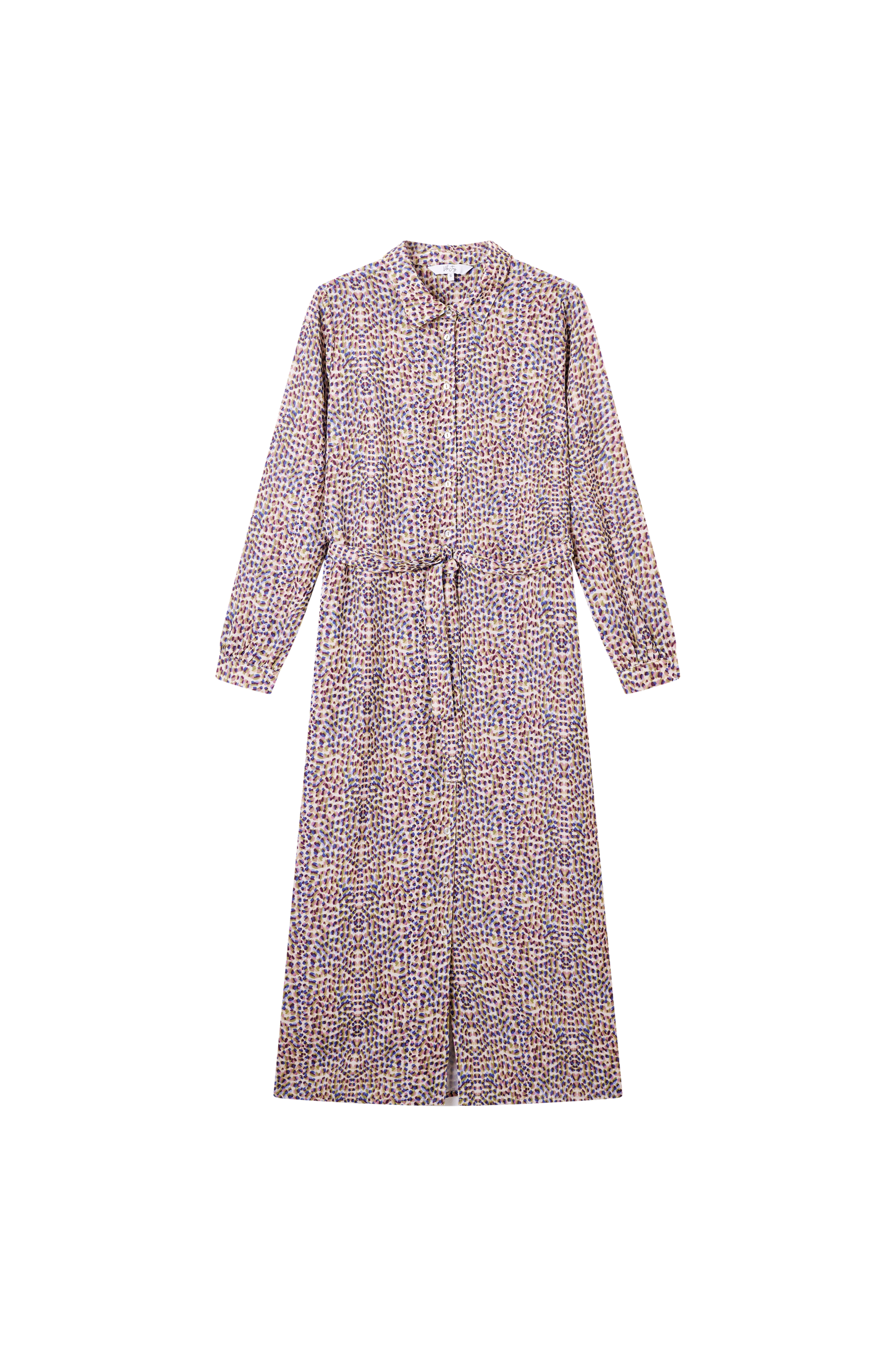 Deze jurk van Vila Joy heeft een allover stippenpatroon, een klassieke kraag, volledige doorknoopsluiting met bijpassend ceintuur.