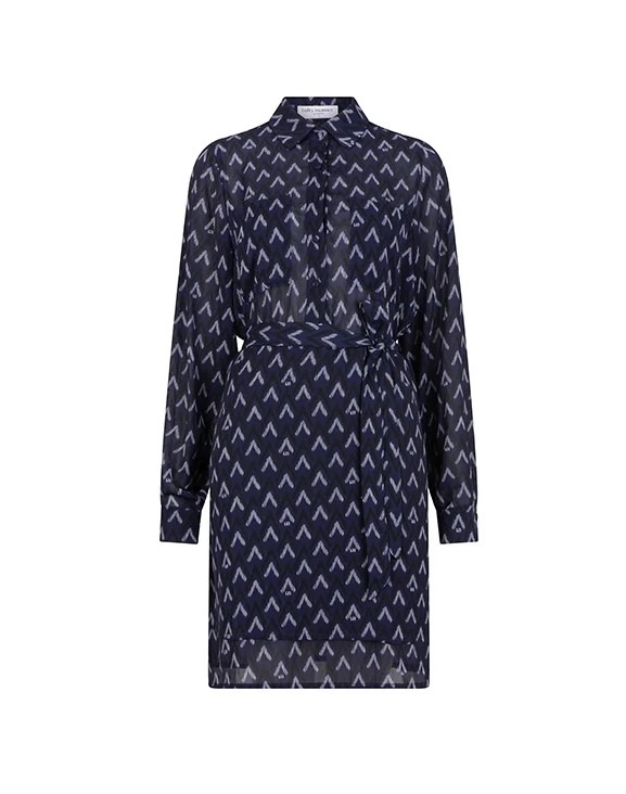 Jurk Jazzy is een blauwe jurk met print. De jurk heeft een klassieke kraag, afneembare riem in de taille en een volant detail aan de onderkant. Verder heeft de blauwe jurk een knoopsluiting en is de jurk qua pasvorm rechtvallend.