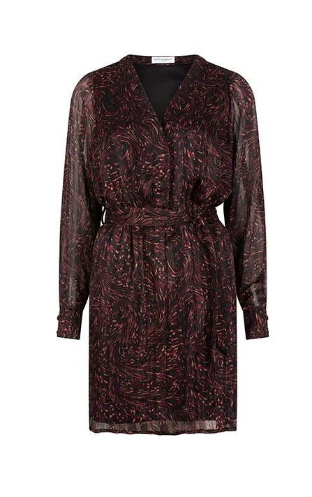 Jurk Freja is een korte jurk met print. De jurk heeft een V-hals, elastiek in de tailleband en een afneembare riem. Verder heeft de jurk knoopjes bij de mouwuiteinden en is de jurk qua pasvorm rechtvallend.