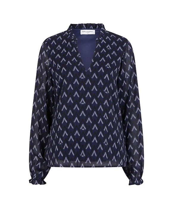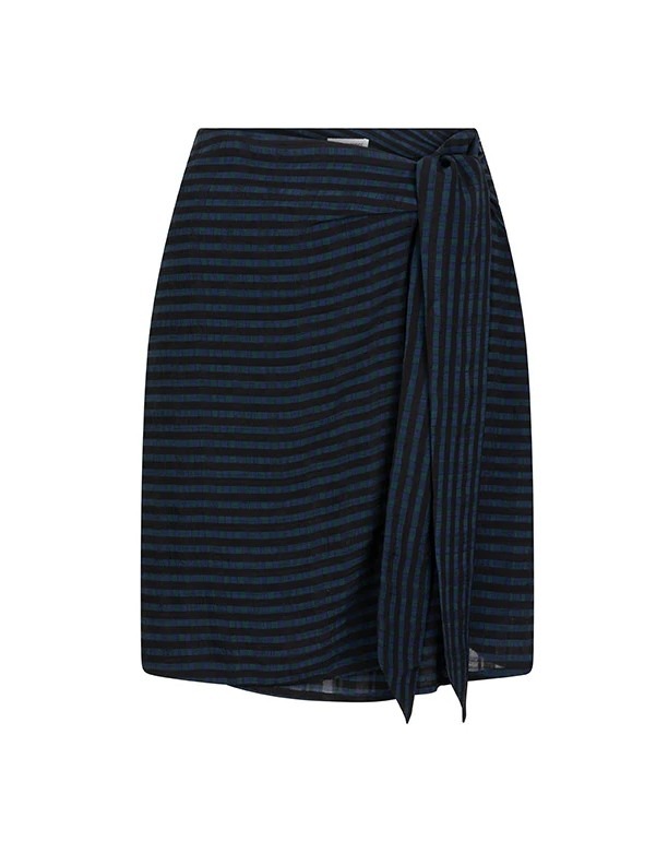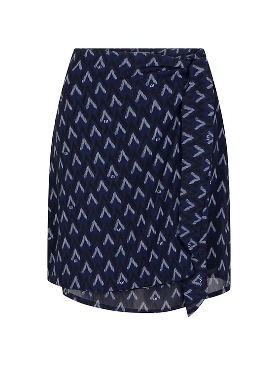 Rok Carol is een korte rok met print. De rok is gemaakt van een geweven stof met patroon, heeft een overslag en knoopdetail aan de linker draagkant. De zwart met blauwe rok heeft een blinde rits aan de zijkant en is qua pasvorm rechtvallend.