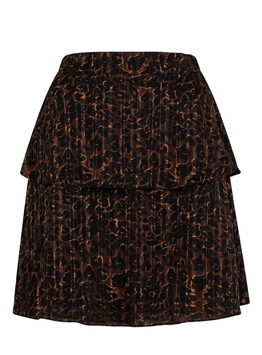 Rok Elin is een korte bruine rok met panterprint. De rok heeft een elastiek in de taille, een blinde rits aan de zijkant en rufflebanen voor een speels effect.