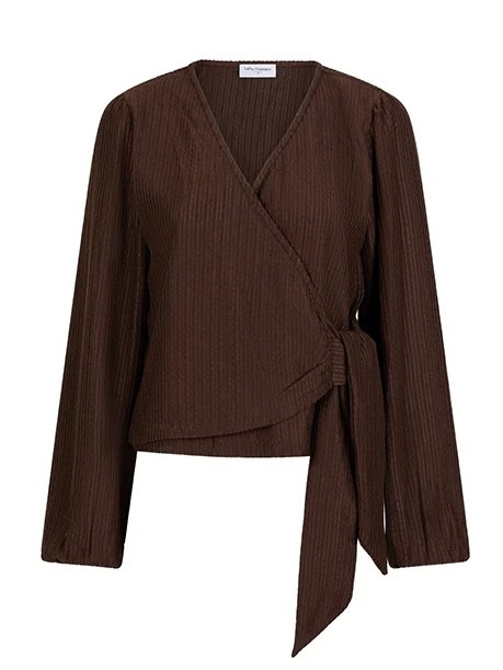 Top Minna is een bruine wrap top met V-hals. De bruine top heeft een strikdetail aan de linker draagkant, subtiele pofmouwen en bevat veel stretch. De top is qua pasvorm aangesloten.