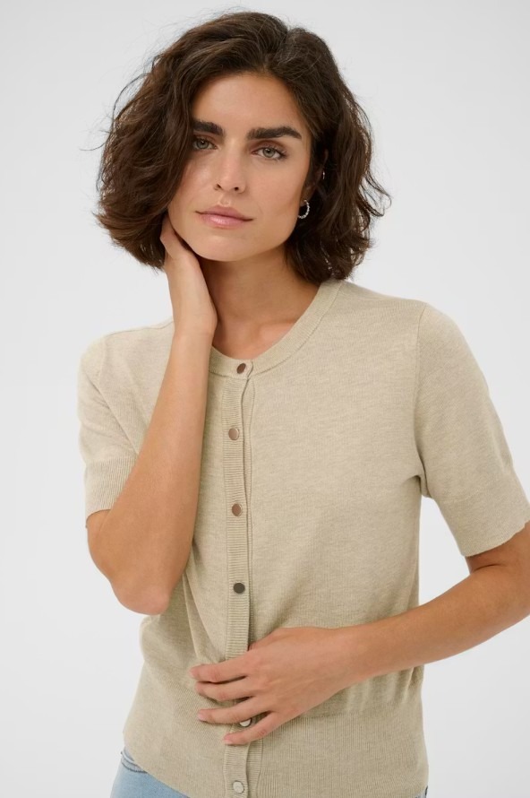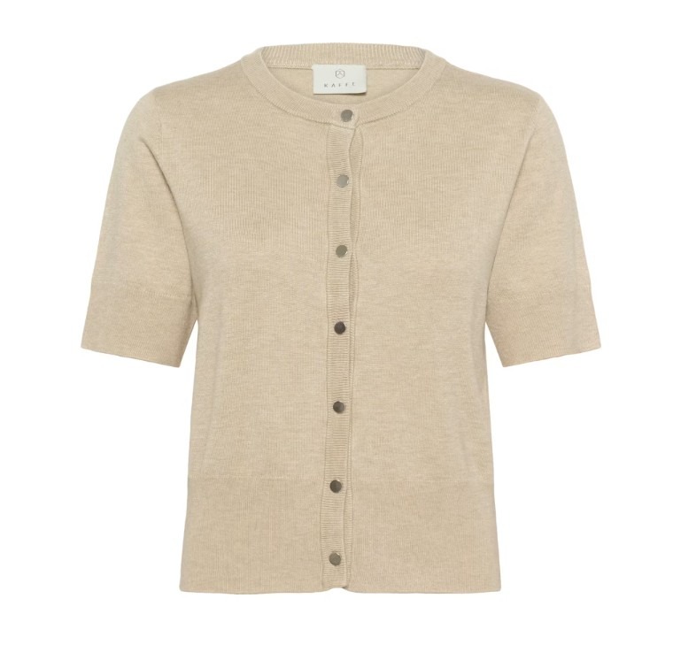 Korte mouwen cardigan met rechte pasvorm en ronde hals. Voorzien van een doorlopende knoopsluiting en ribgebreide boorden voor een tijdloze stijl