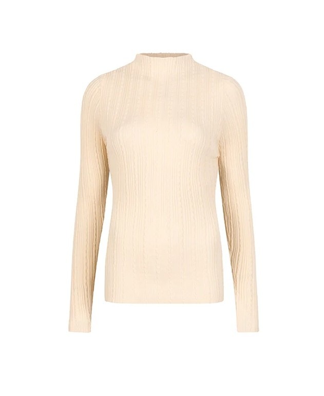 Top Rose is een beige aangesloten top met patroon. De gebreide beige top heeft een opstaande kraag en bevat veel stretch.