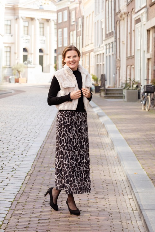 Deze plisse rok heeft een allover dessin met een elastische band.