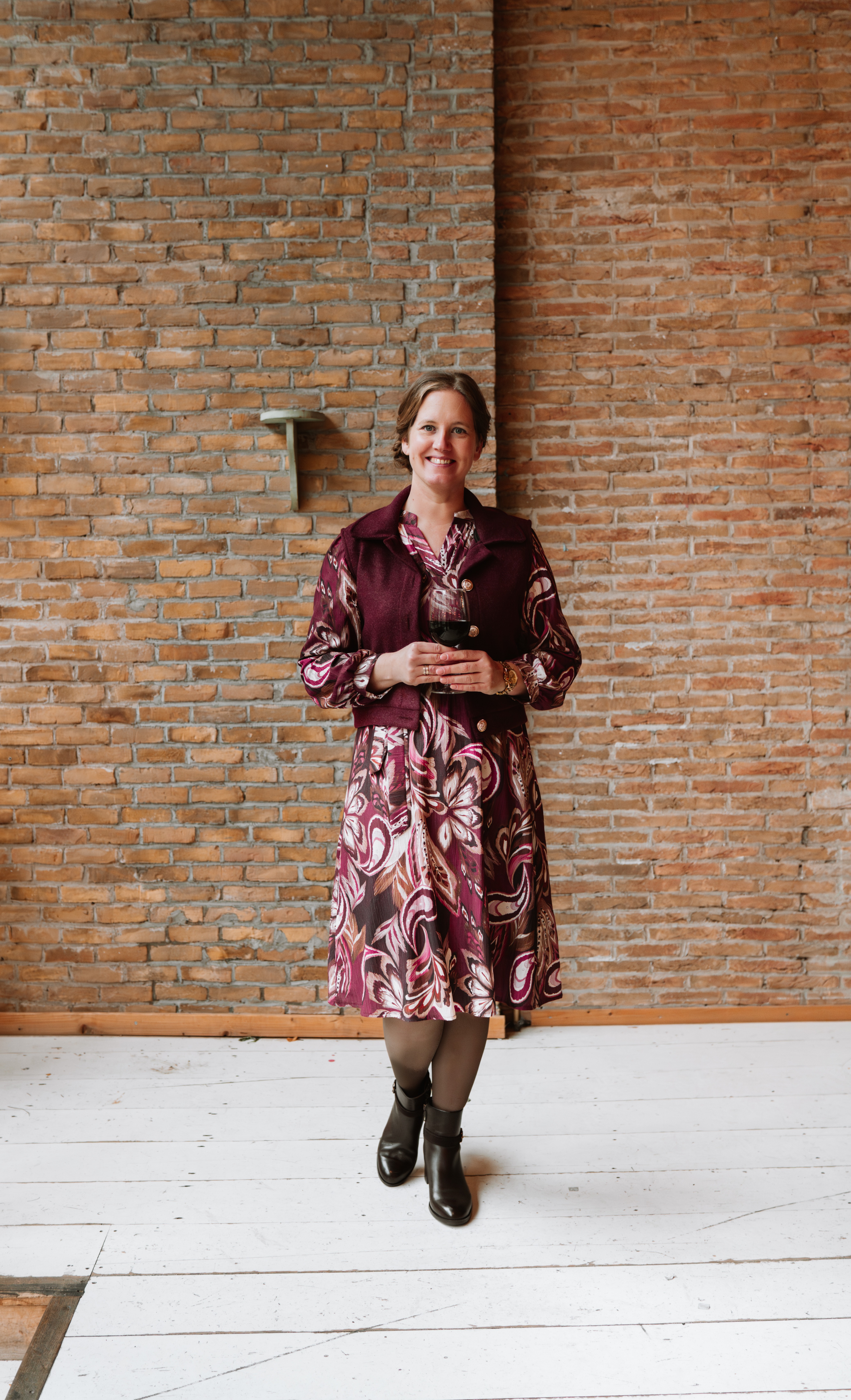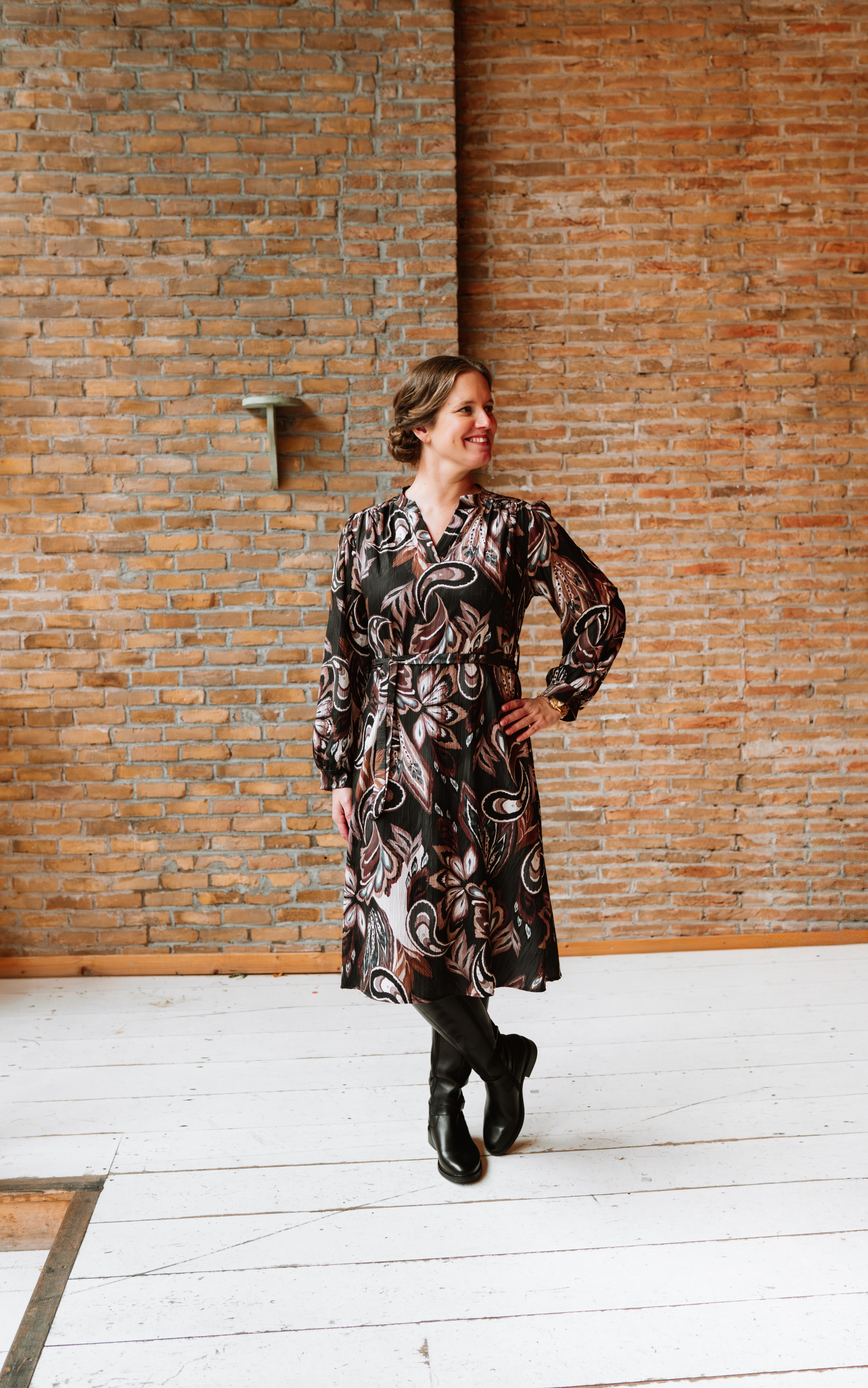 Deze jurk van ons label Stralend, heeft een uitlopend model. De jurk heeft een v-hals, bijpassend ceintuur en lange mouwen met een smal boord en is vanaf de taille gevoerd.