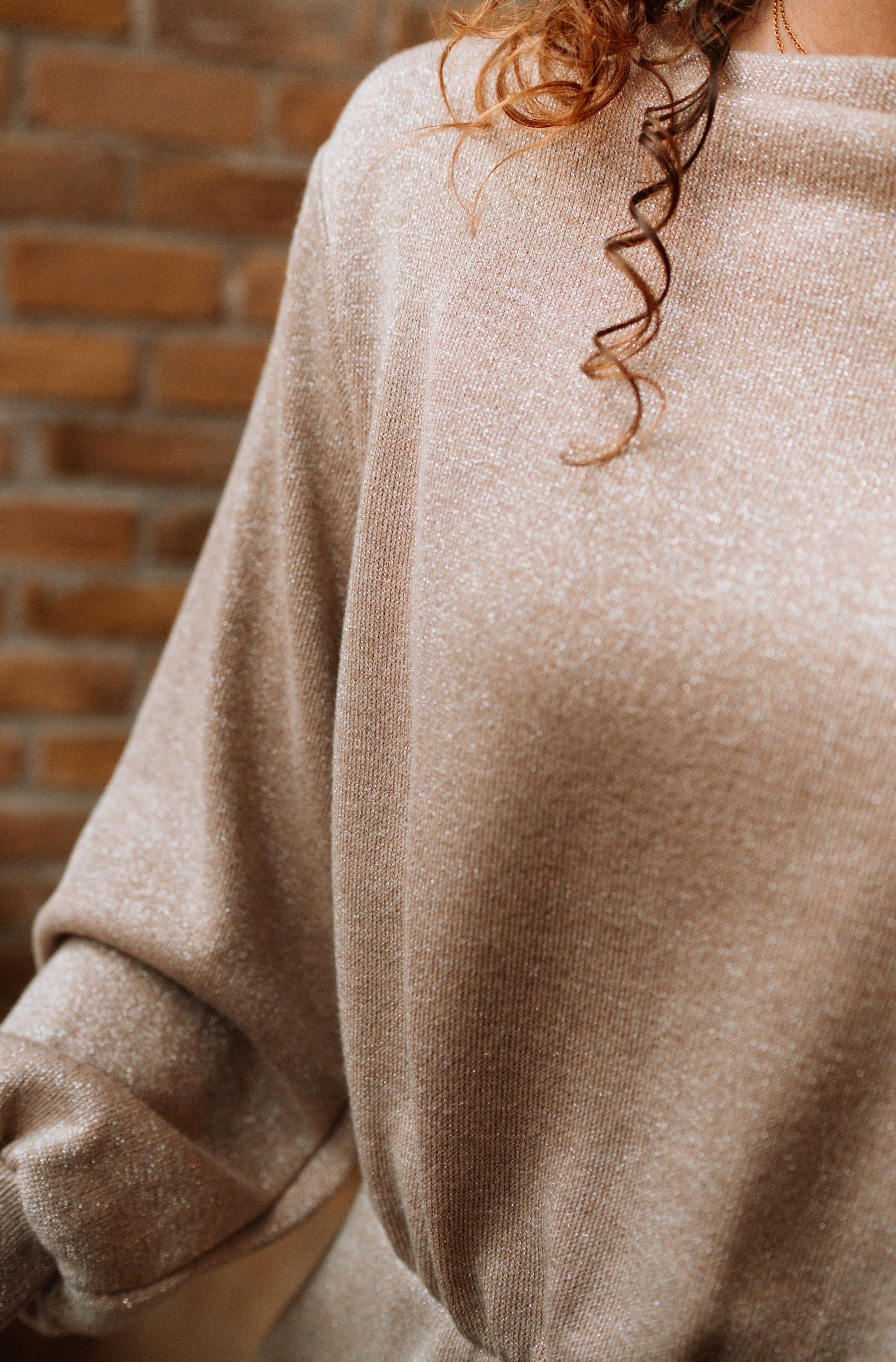 Deze jurk van Amelie & Amelie heeft een elastiek in de taille waardoor je een blouson-effect creeert. De jurk heeft een zilverdraad in de stof