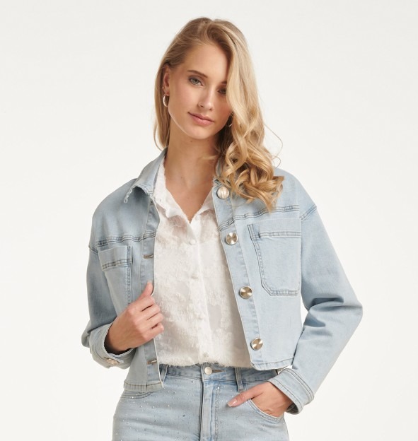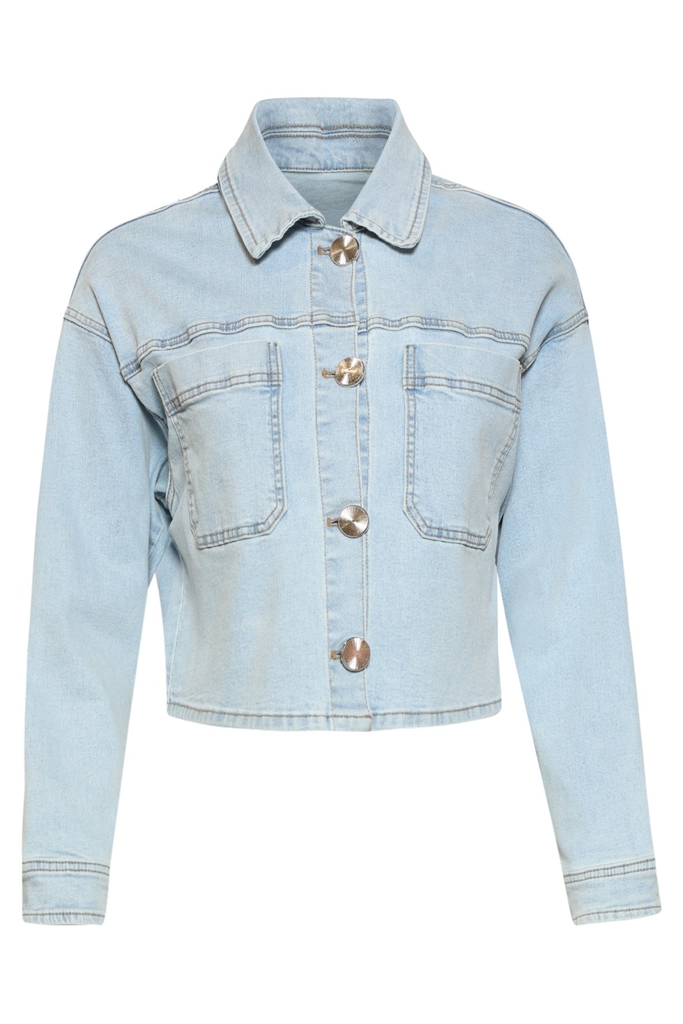 Dit korte spijkerjasje van Smashed Lemon is de ideale finishing touch voor elke outfit. Het jasje is uitgevoerd in een frisse lichtblauwe wassing en valt op door de grote, zilverkleurige sierknopen die het kledingstuk een moderne, bijna vintage-achtige uitstraling geven. De verlaagde schoudernaden en de boxy pasvorm zorgen voor een eigentijdse look die zowel stoer als chic is.