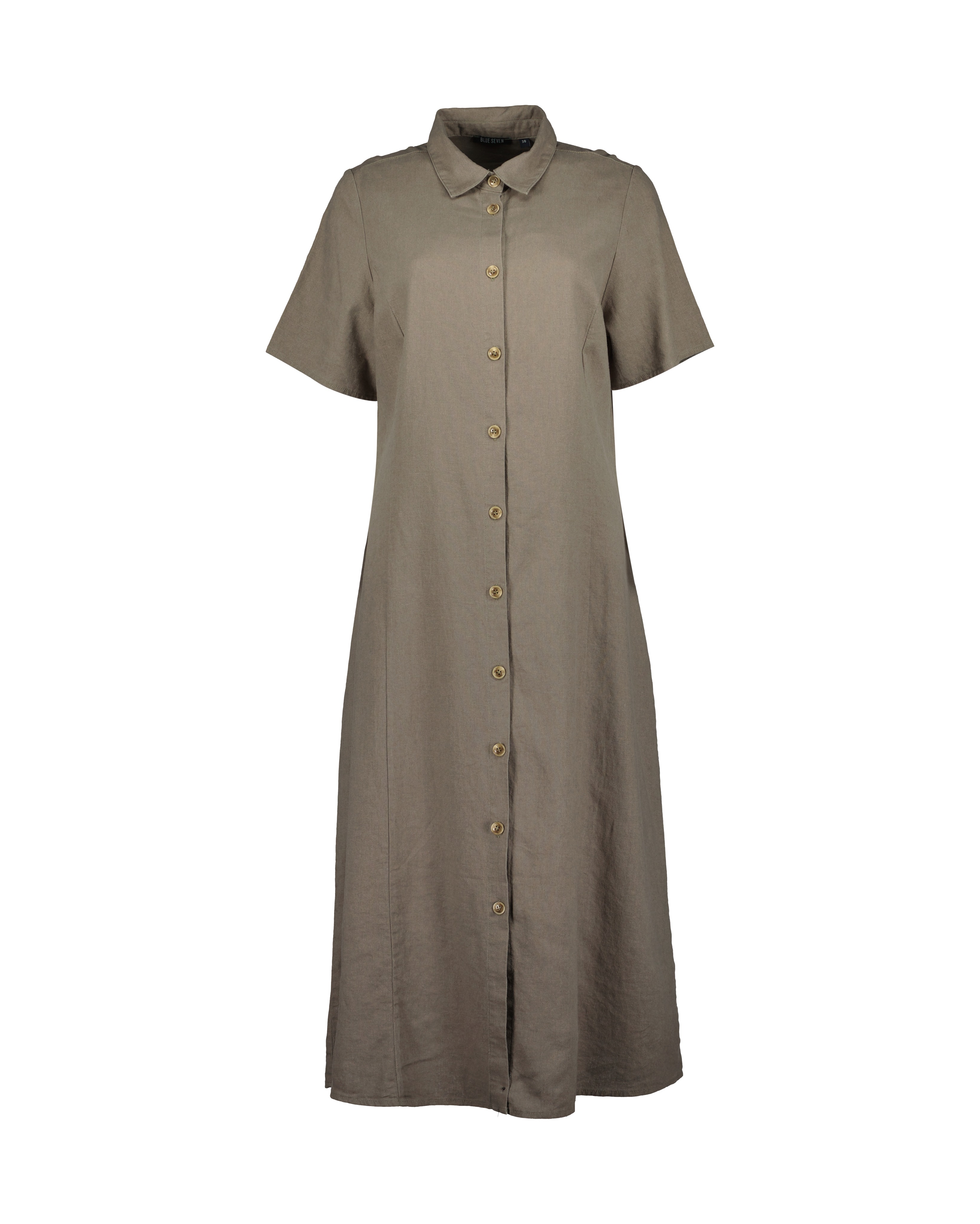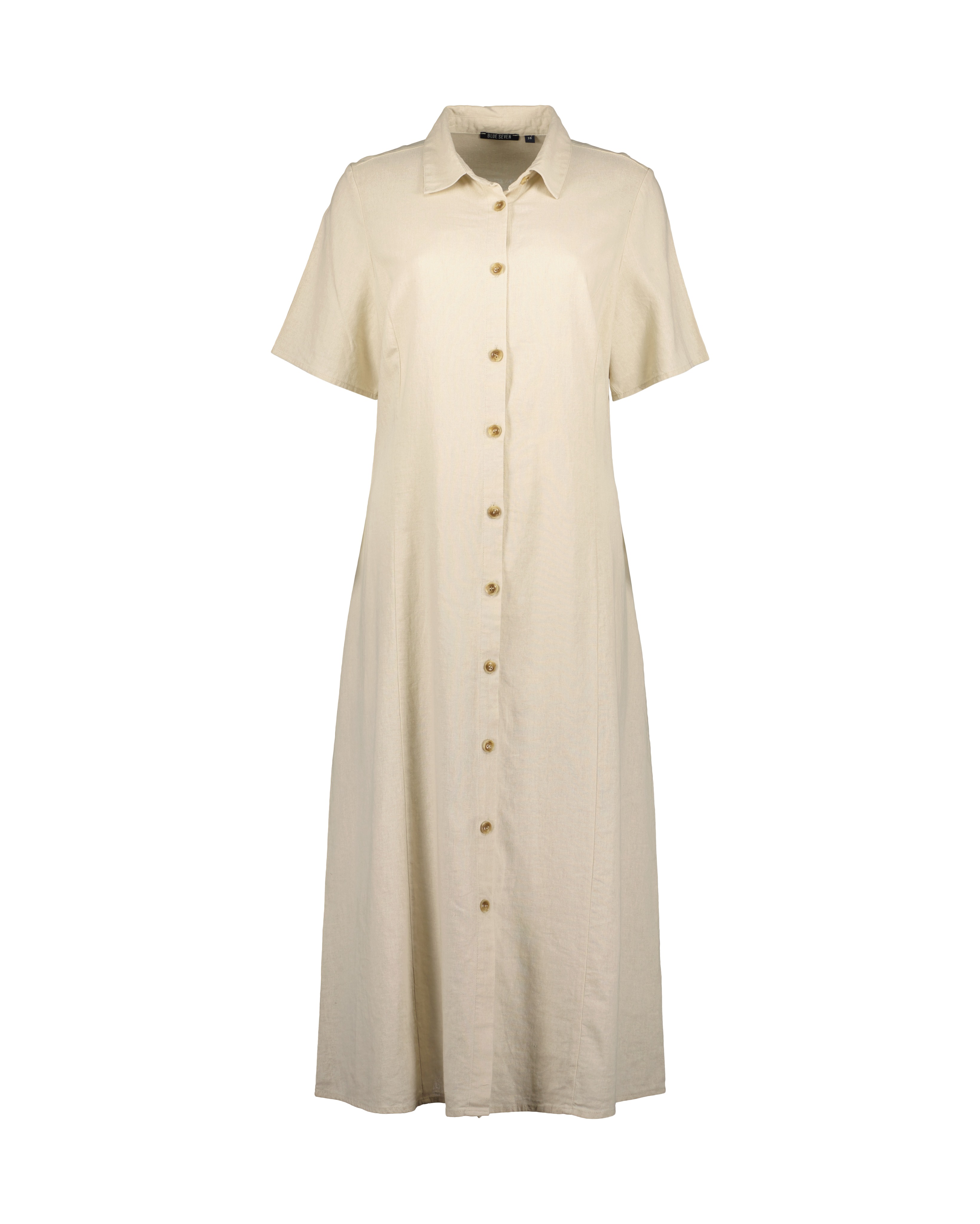 Deze jurk van Blue Seven heeft een linnenlook, volledige doorknoop, klassiek kraagje en korte mouwen.