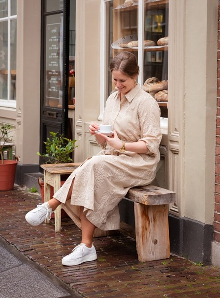 Deze jurk van HV Polo heeft een geborduurd bladmotief met pailletjes, de jurk heeft een klassieke kraag, doorknoopsluiting en een tunnelkoord.