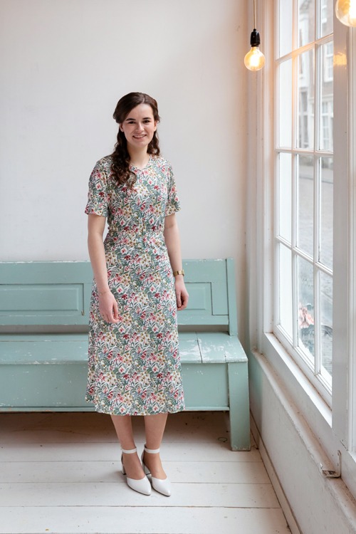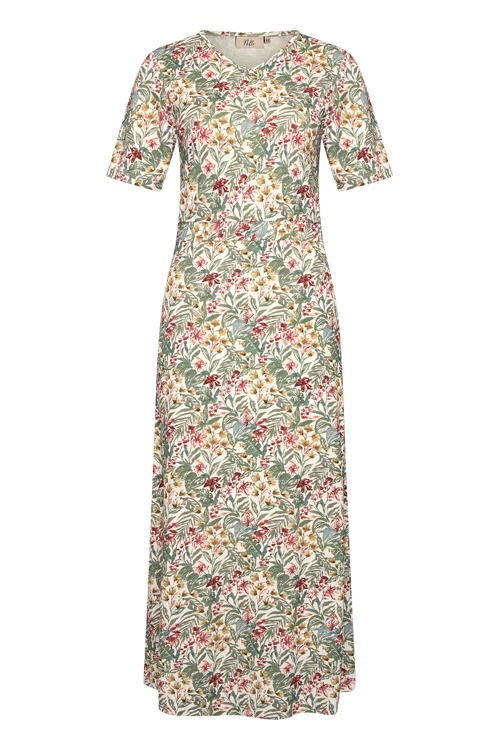 Deze jurk heeft een allover jackpot print, de jurk heeft een v-hals, elastiek in de taille en korte mouwen.