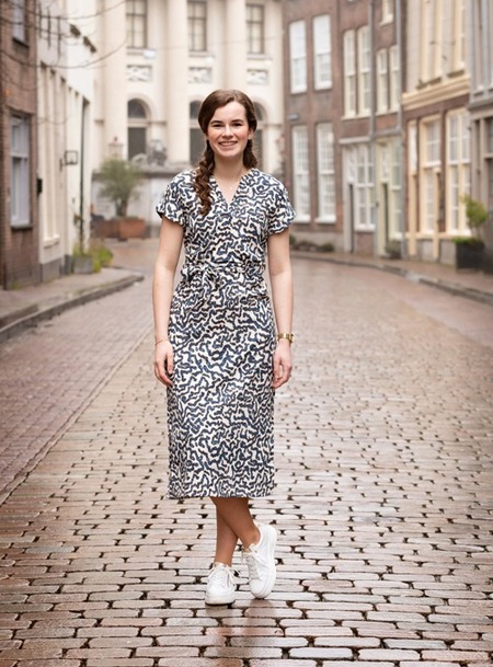 Deze jurk van Garcia heeft een allover dessin, v-hals, splitjes aan de zijkant en een bijpassend ceintuur.