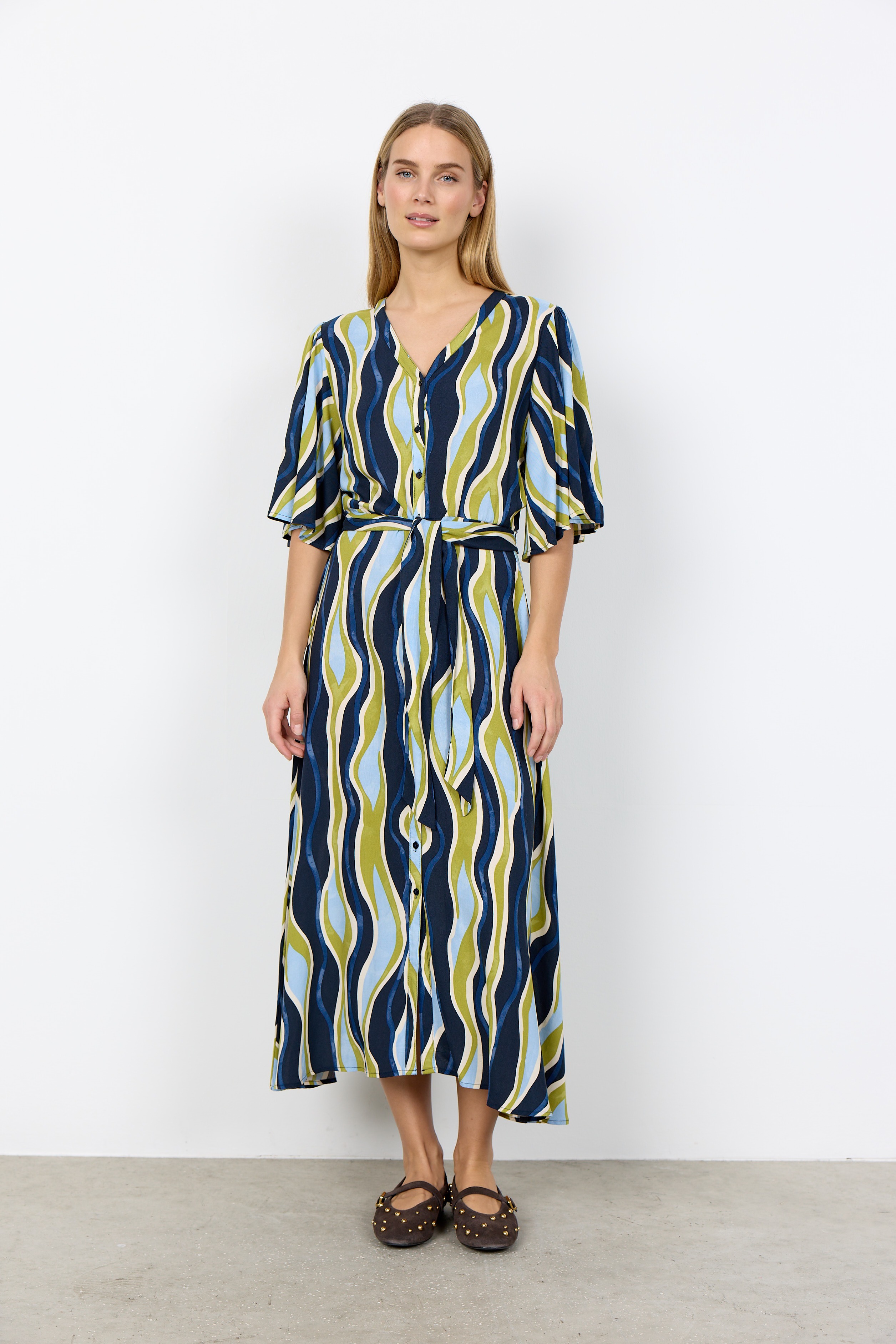 Deze elegante jurk heeft een V-hals, korte, zwierige mouwen en een knoopsluiting aan de voorkant met een stijlvolle abstracte print. Combineer hem met elegante sandalen voor een unieke en coole look.