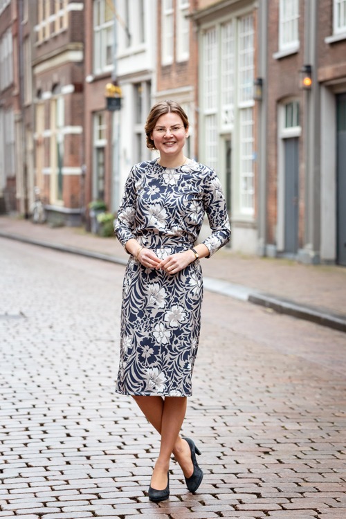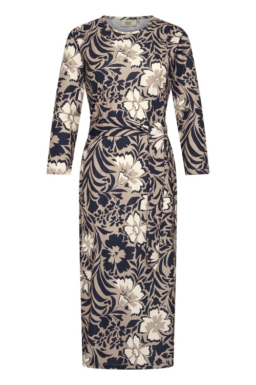 Deze jurk van Nelle heeft een allover klassieke print, in de kleuren; zand, ecru en marine. De jurk heeft een ronde hals, 3/4 mouwen en een bijpassend ceintuur.