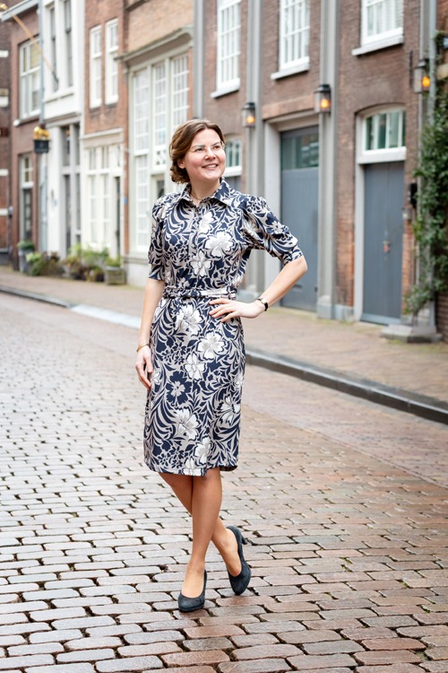 Deze jurk van Nelle heeft een allover klassieke print, in de kleuren; zand, ecru en marine. De jurk heeft een kraagje met knoopsluiting, korte pofmouwen en een bijpassend ceintuur.