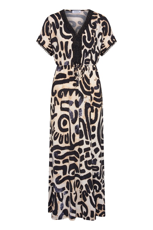 Deze jurk van Batida heeft een allover dessin, de jurk heeft korte mouwen met gebreid detail, v-hals en een tunnelkoord.