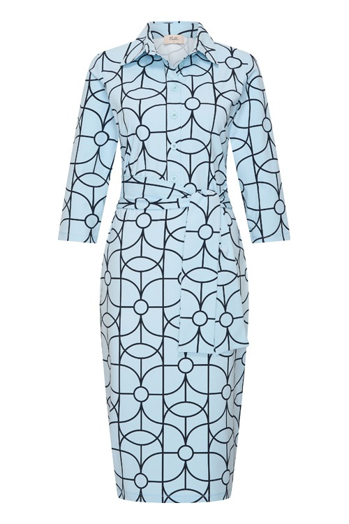 Deze jurk van Nelle is in de bekende travelkwaliteit en heeft een allover grafische print, de jurk heeft een kraagje met halve doorknoopsluiting, 3/4 mouw en een bijpassend ceintuur.