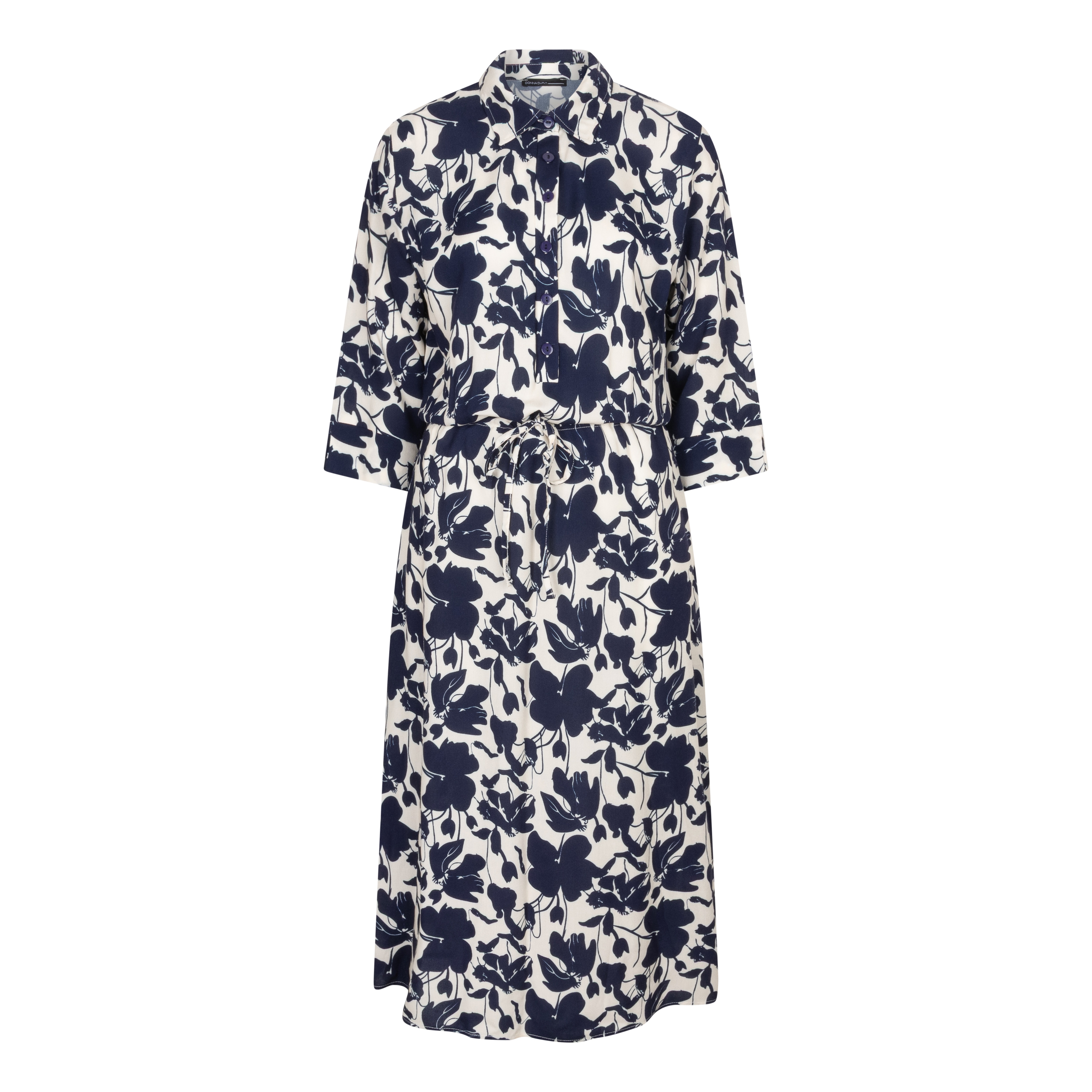Deze jurk van Donna Dura heeft een bloem/bladprint, de jurk heeft een kraagje met knoopsluiting en 3/4 wijde mouwen.