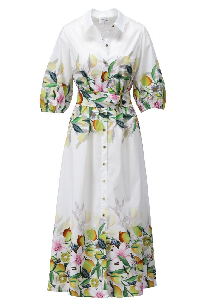 Deze jurk van K-Design heeft een postzegelplaatjes dessin, een klassieke kraag en volledige knoopsluiting en een bijpassend ceintuur.