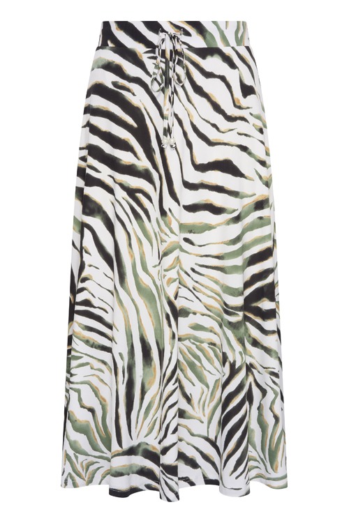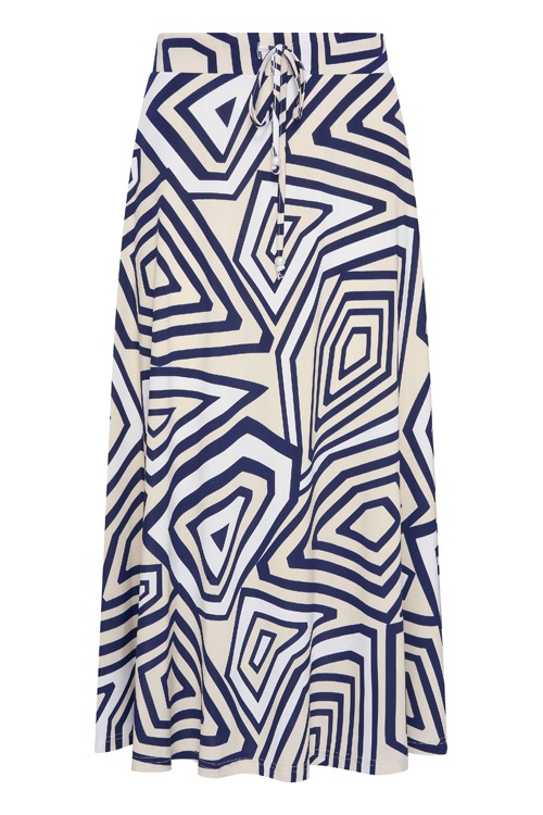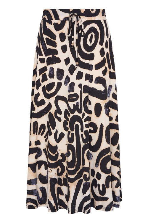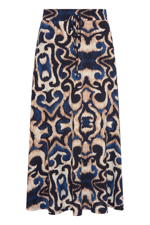 Deze rok van Batida heeft een allover dessin, de rok heeft een elastische band met tunnelkoord en is uitlopend.