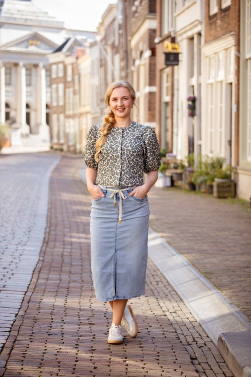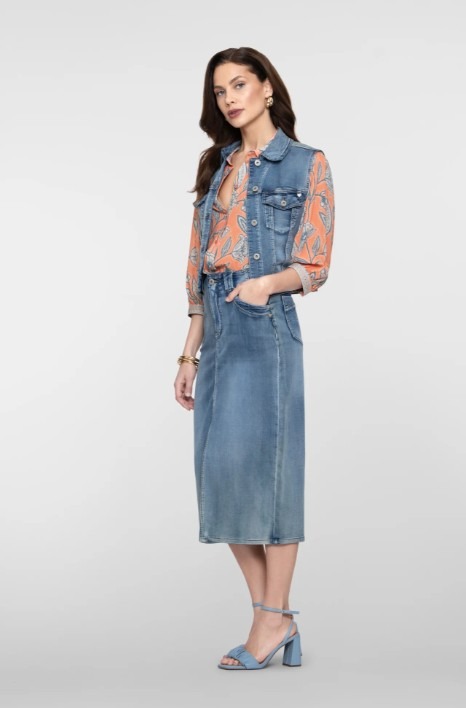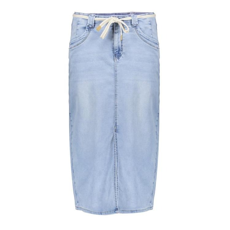Deze rok uit onze S26-1 collectie is uitgevoerd in een denim wassing. Het ontwerp heeft een vrouwelijke midi-lengte, een subtiele split aan de voorzijde, steekzakken en een koordsluiting in de taille. Perfect voor een eigentijdse, comfortabele look van dag tot avond.