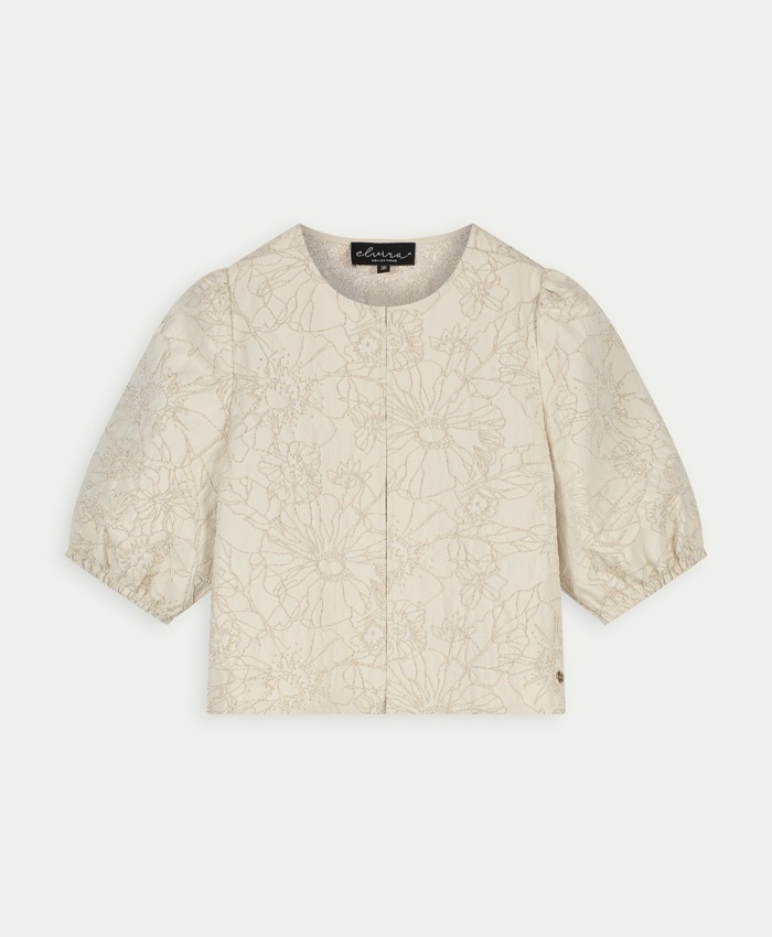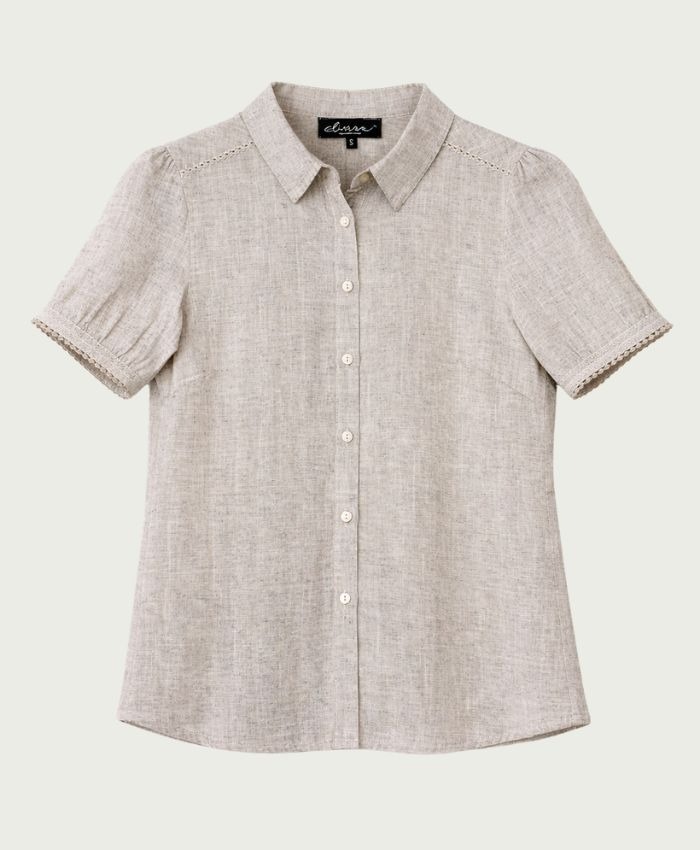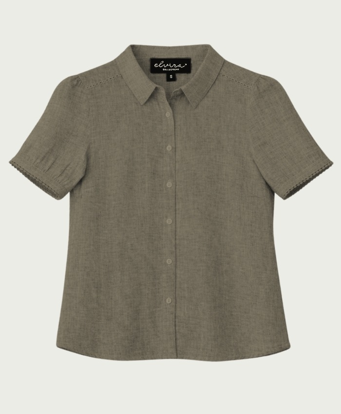Deze blouse van Elvira heeft een fijne structuur in de stof, klassieke kraag, volledige doorknoop en korte mouwen met een ruchelrandje.