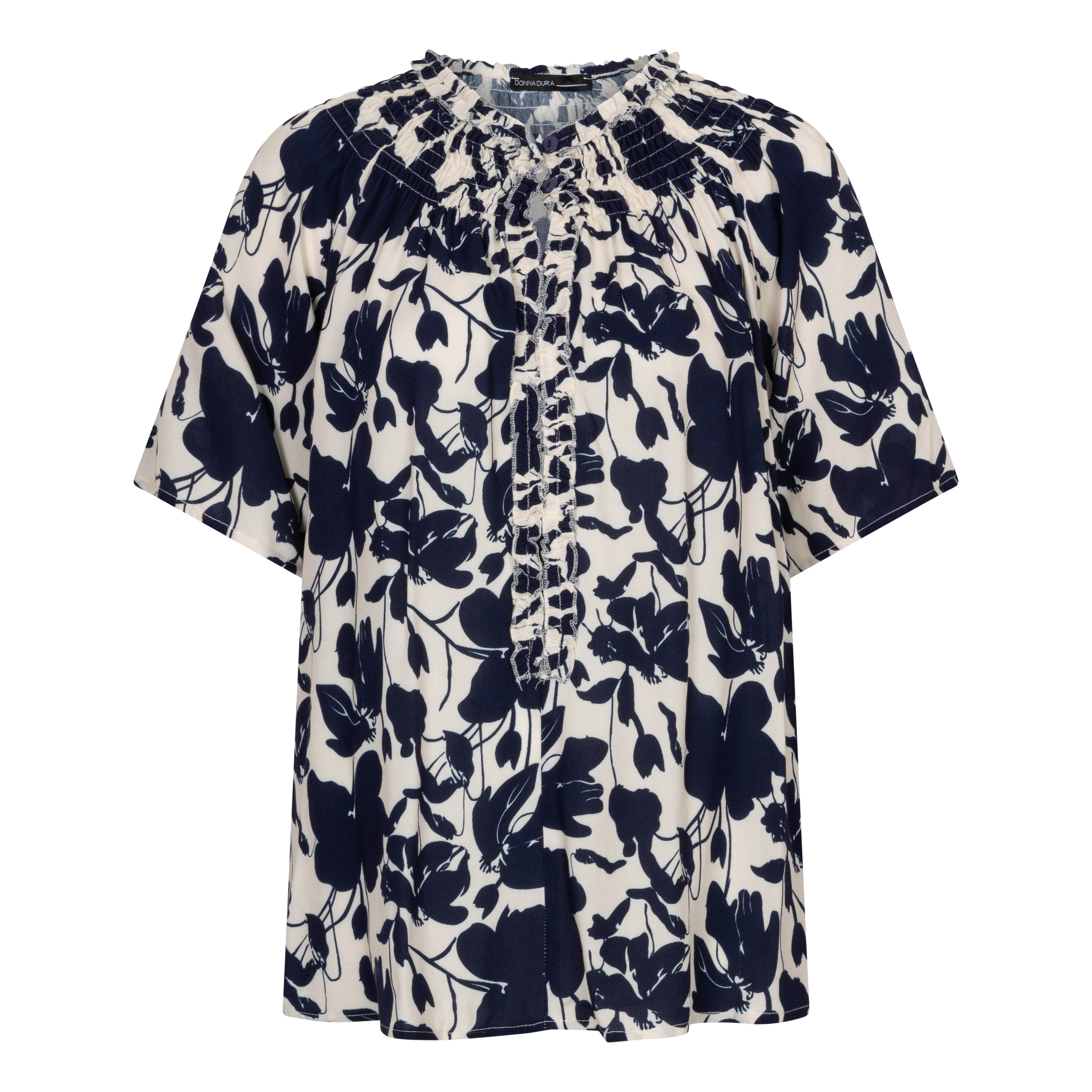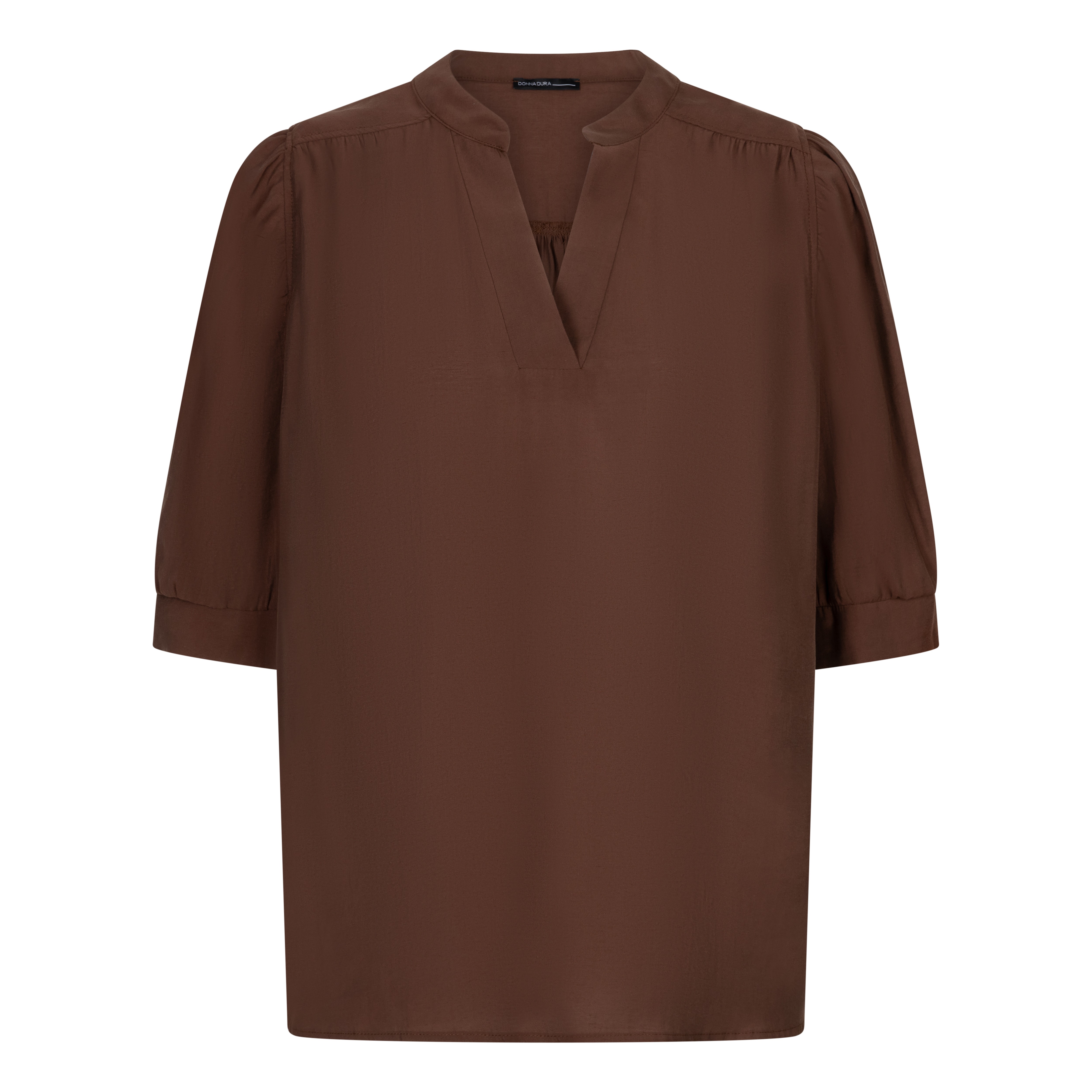 Deze top van Donna Dura heeft een v-hals en ballonmouwen.