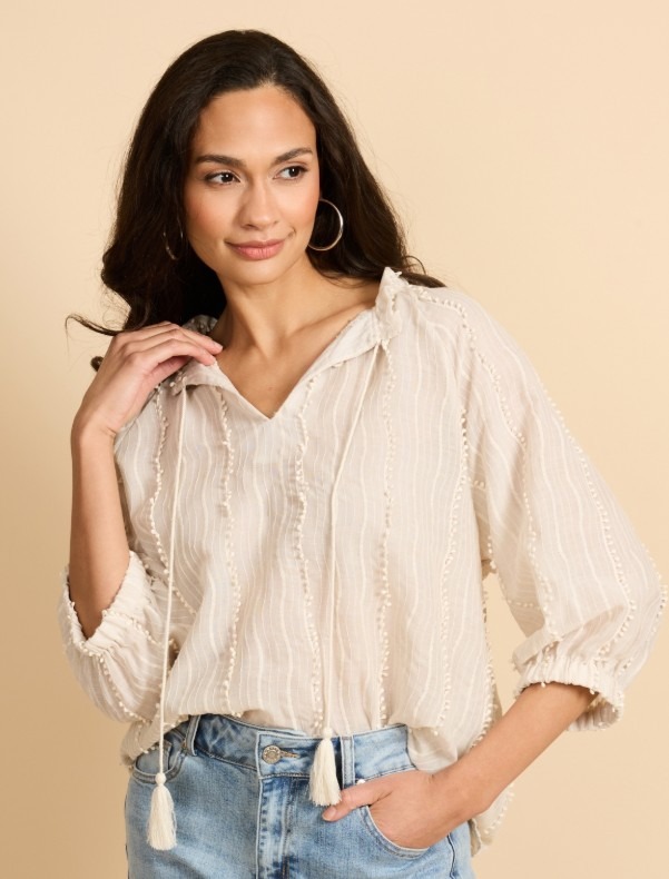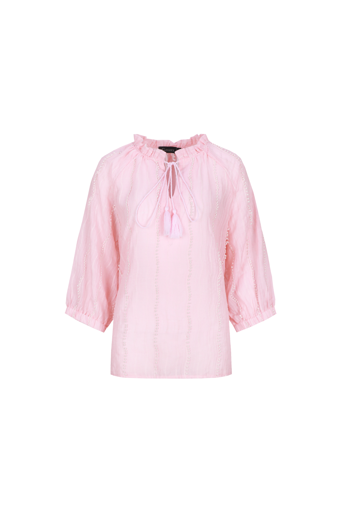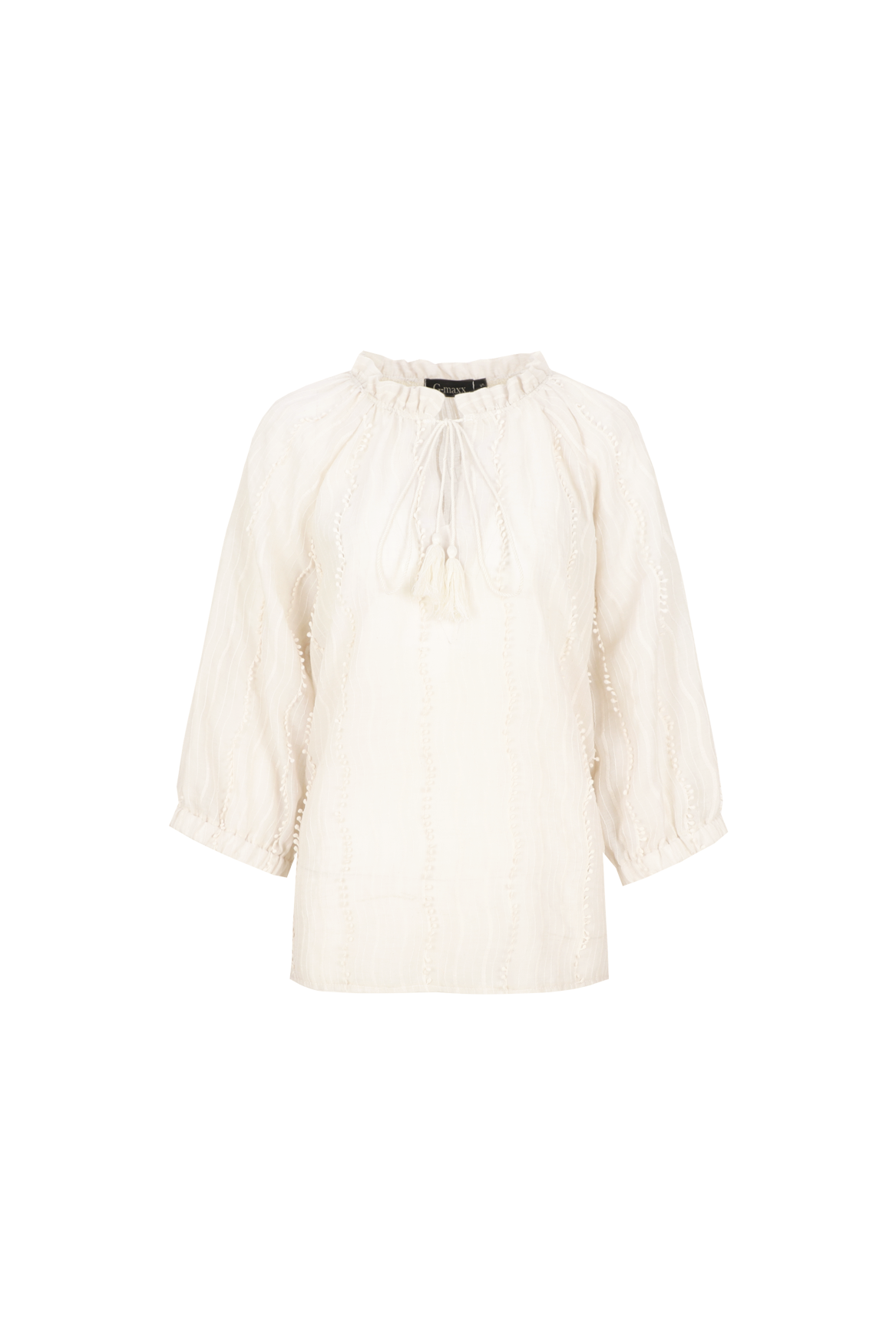 De Meliora blouse is een luchtige, vrouwelijke top met verfijnde details. Het model heeft een losvallende pasvorm met een subtiele V-hals en striklinten met kwastjes. De driekwartmouwen met elastische boord geven de blouse een zachte, volumineuze uitstraling. De stof is verrijkt met een fijn reliëf en subtiele structuur, wat zorgt voor extra diepte in het ontwerp.