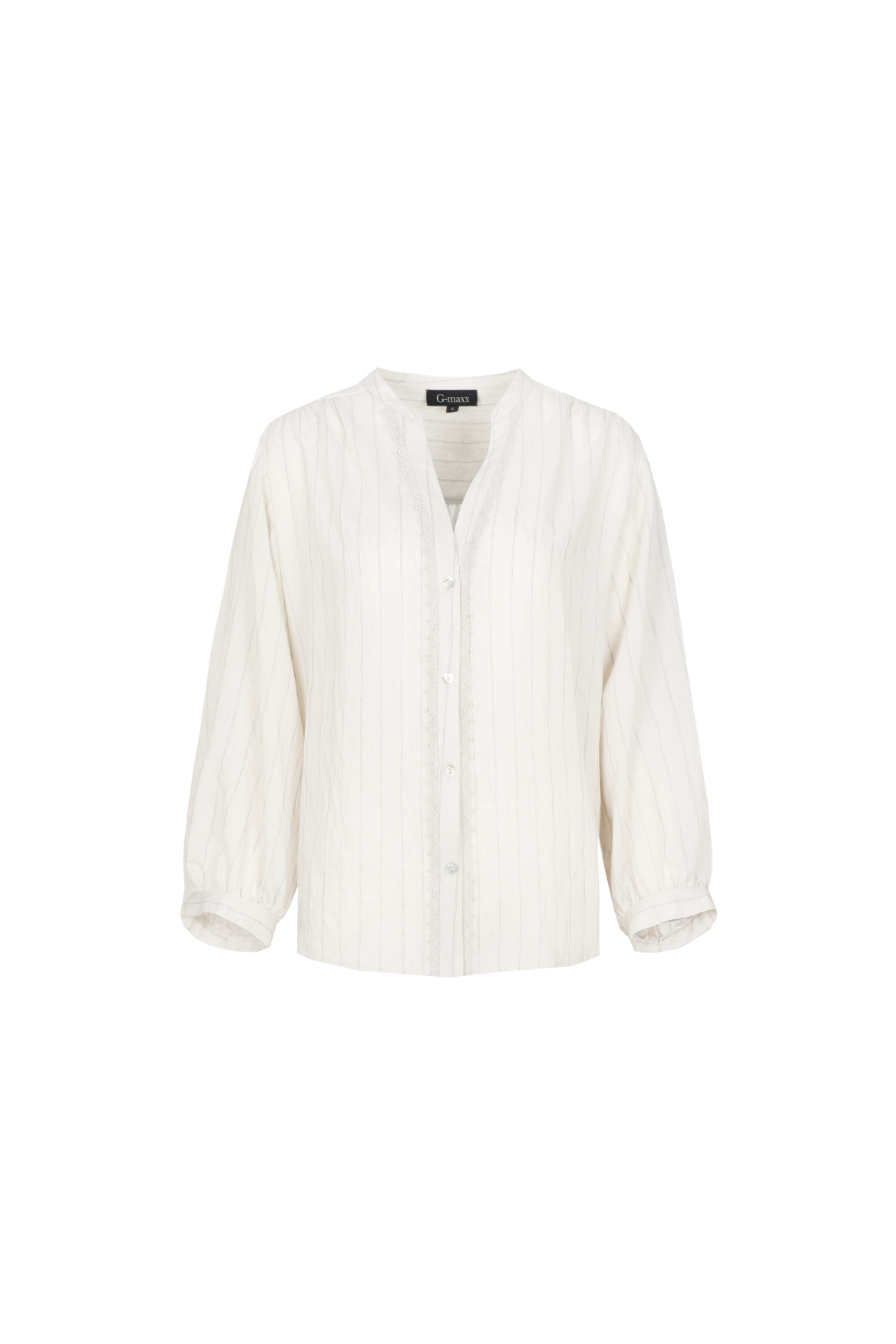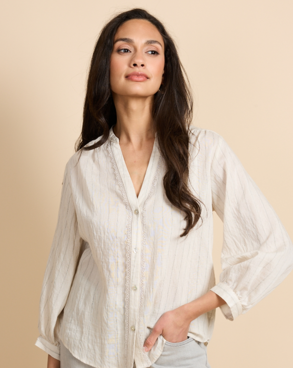 De Wivine blouse is een luchtige blouse met een verfijnde uitstraling. Het model heeft een rechte, losvallende pasvorm en is voorzien van een subtiele V-hals met knoopsluiting. De fijne structuur in de stof en het sierlijke kanten detail langs de sluiting geven de blouse een vrouwelijke touch.