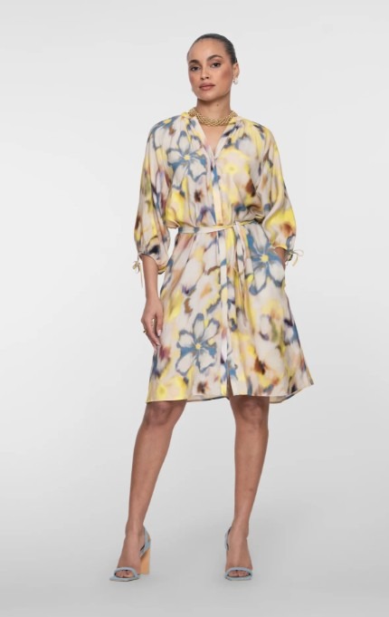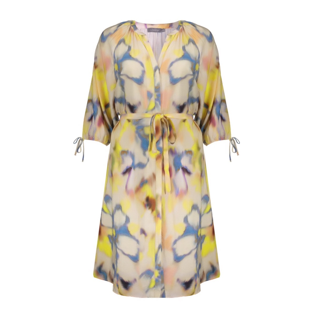 Deze blouse van Geisha is uitgevoerd in een luchtige, soepelvallende kwaliteit met een zachte butteryellow aquarelprint, aangevuld met subtiele kleuraccenten. De ronde hals is afgewerkt met fijne strikkoordjes voor een vrouwelijke touch, wijd vallende mouwen met elastische zomen zorgen voor een elegant volume en comfortabel draaggemak.