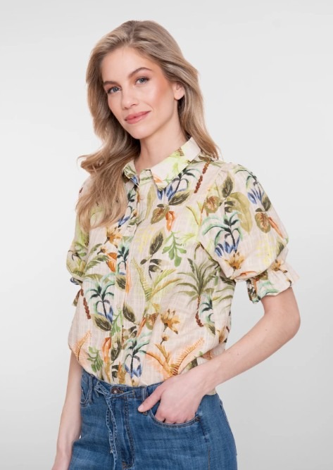 Deze dames blouse uit onze S26-2 collectie is uitgevoerd in een verfijnde botanische print in zachte groentinten met warme accenten. De subtiele blokstructuur in de stof geeft extra diepte aan het ontwerp. De klassieke kraag en doorknoopsluiting zorgen voor een rustige basis, terwijl de pofmouwen met elastische manchet en ruffle een verfijnd en speels detail toevoegen. Een blouse die opvalt door haar rijke uitstraling.