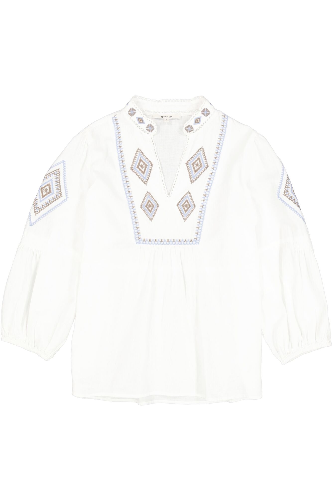 Deze top van Garcia heeft borduursel bij de hals en op de mouw. De top heeft een v-hals en 3/4 mouwen.