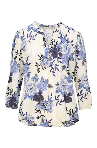 Deze top van Dreamstar heeft een bloemendessin met een lurexstreep. De top heeft een v-hals, 3/4 mouwen en elastiek aan het boord.