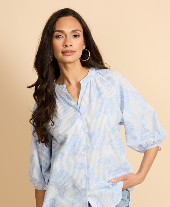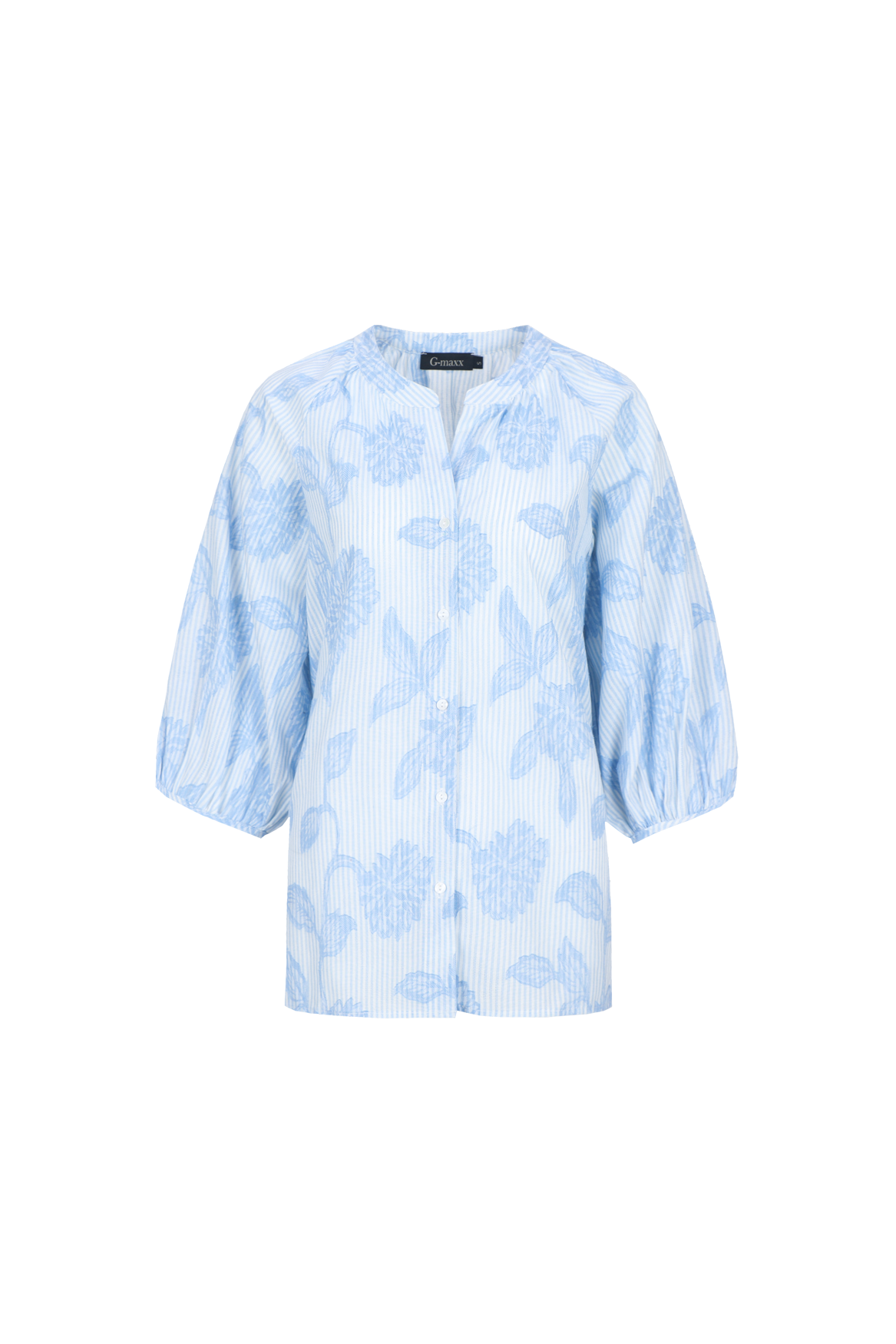 De Kairi blouse is een luchtig model met een frisse, vrouwelijke uitstraling. De blouse heeft een rechte, losvallende pasvorm en een ronde hals met kleine V-uitsparing en knoopsluiting. De driekwartmouwen met lichte pof en elastische boord geven het ontwerp een zachte, speelse touch. De combinatie van fijne strepen met een subtiele bloemenprint zorgt voor een levendig maar stijlvol geheel.