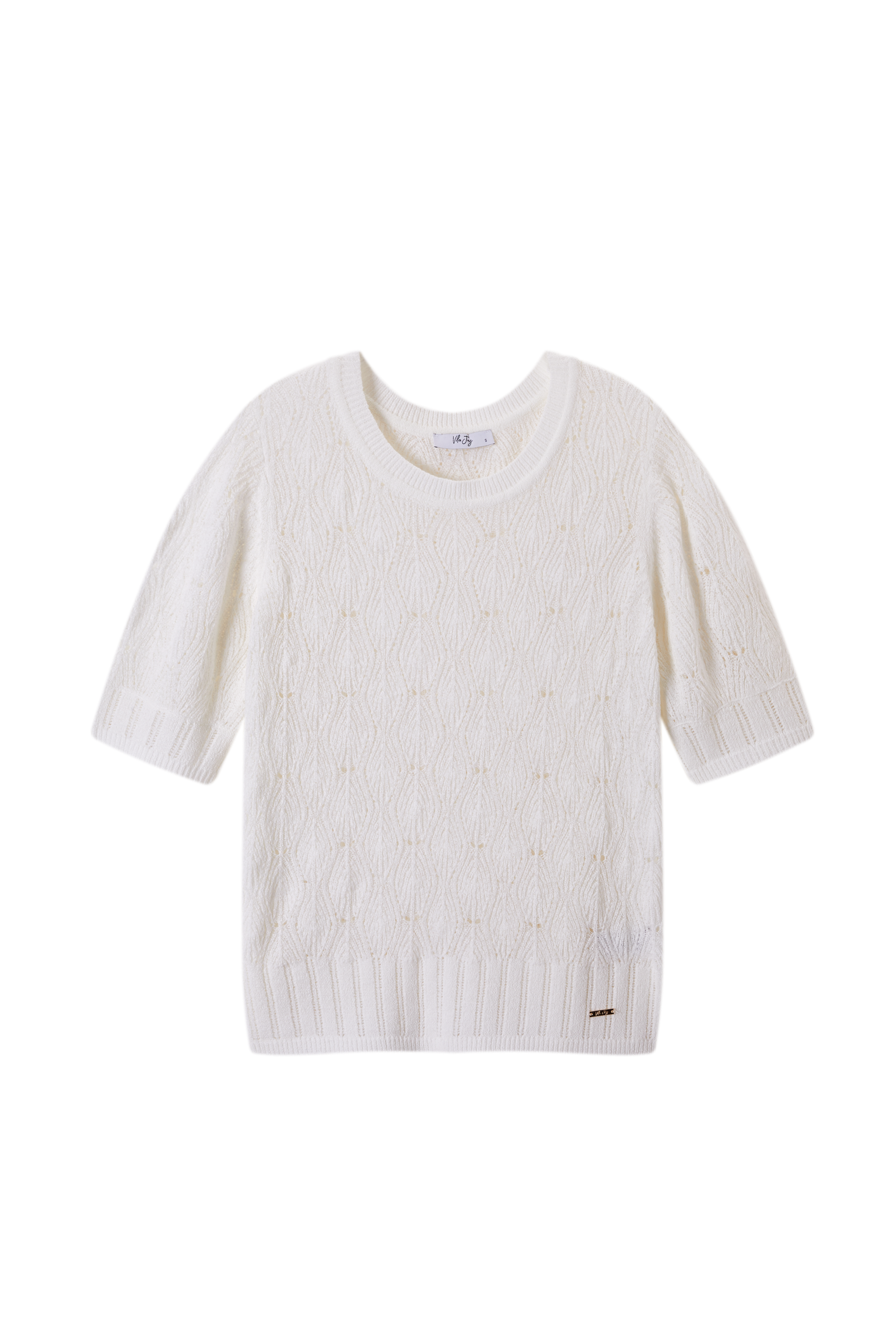 Dit truitje van Vila Joy heeft een opengewerkte stof, ronde hals en korte mouwen.