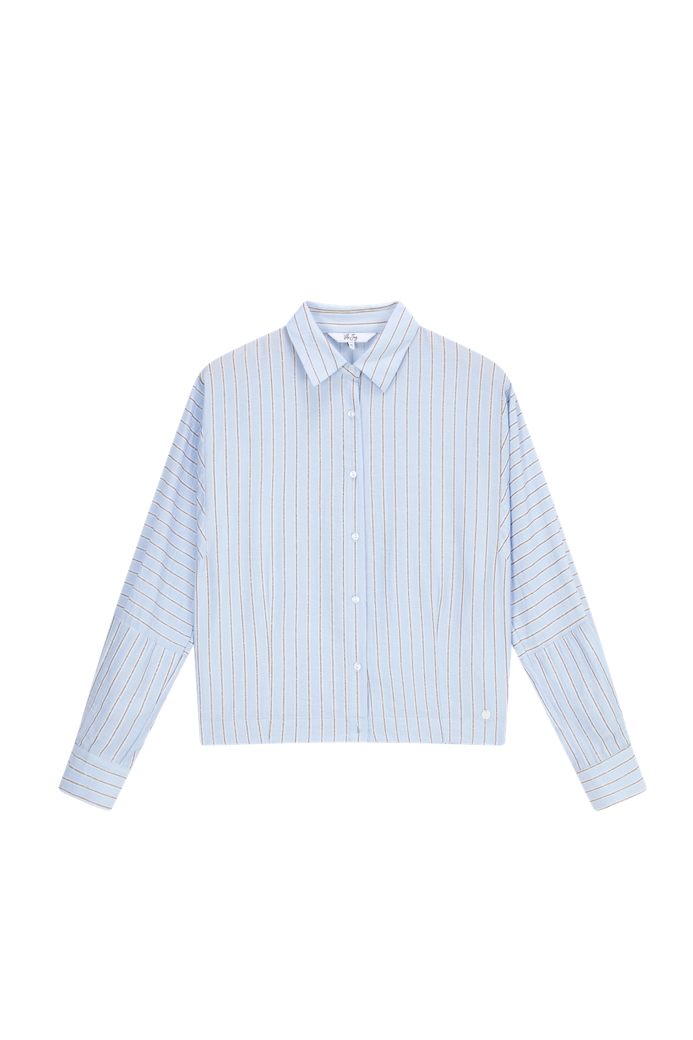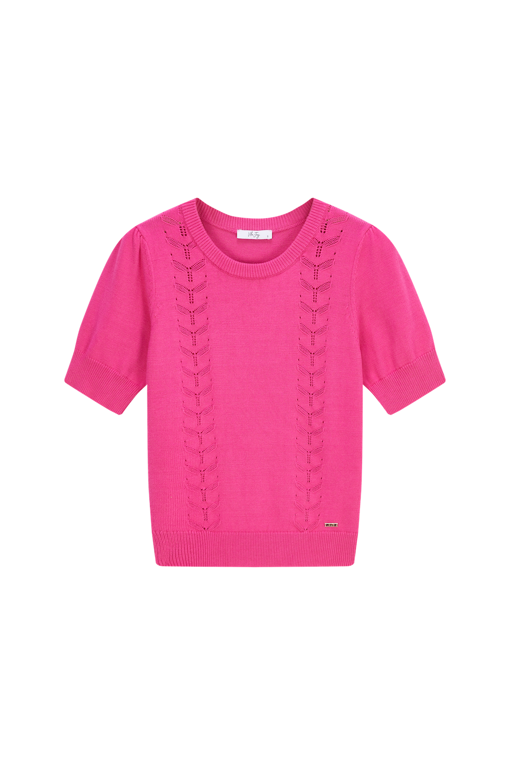 Deze trui van Vila Joy heeft een palmbomen motief in de stof, de trui heeft een ronde hals en korte mouwen.