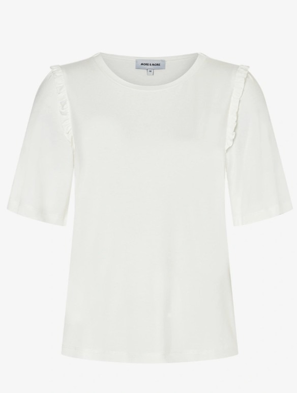 Minimalistisch met een subtiel detail: dit strakke T-shirt van MORE & MORE is een echte stijlklassieker. De ingetogen ruches op de schouders geven een vrouwelijke touch en maken van dit basic item een echte blikvanger. Dankzij de zachte stof en comfortabele pasvorm is het op talloze manieren te combineren – casual met een jeans of juist chic onder een blazer.
