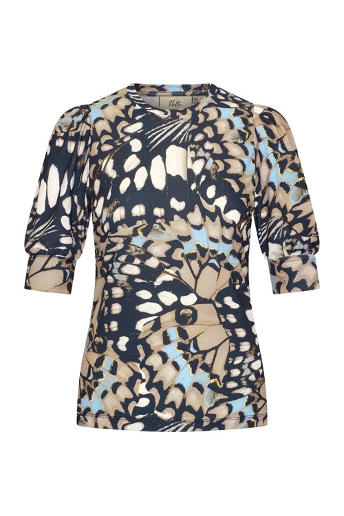 Dit t'shirt van Nelle heeft een allover verenprint, een ronde hals en pofmouwen.