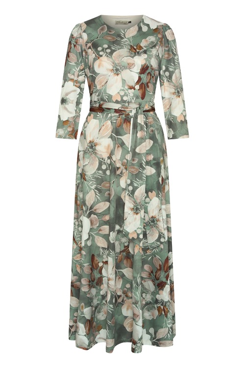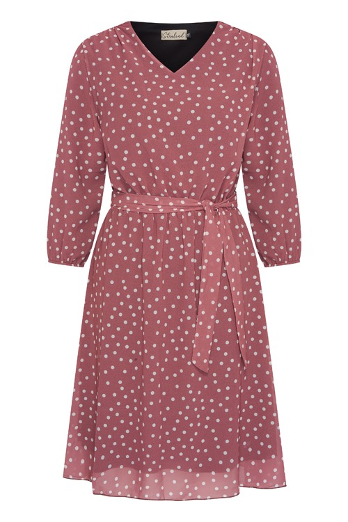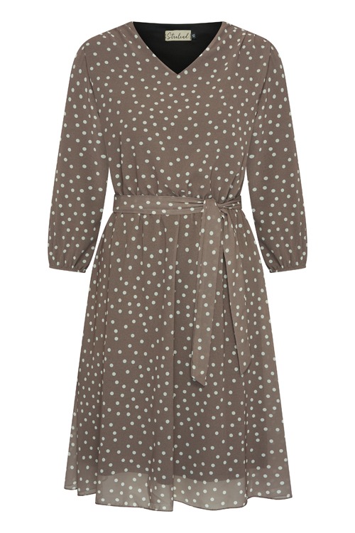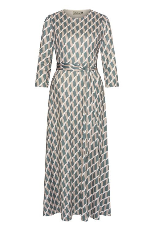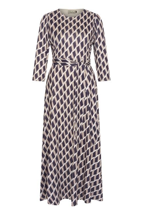 Deze jurk van ons label 'Stralend' heeft een allover grafisch dessin, de jurk heeft een ronde hals, elastiek in de taille, 3/4 mouwen, een bijpassend ceintuur en is volledig gevoerd.