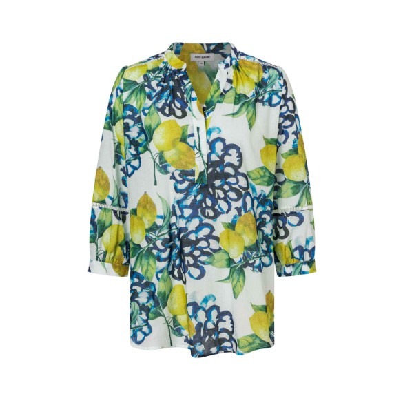 Deze blouson van More & More heeft een allover citroendessin, de blouse heeft een v-hals met knoopjes, 3/4 mouwen met opengewerkt randje.