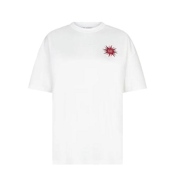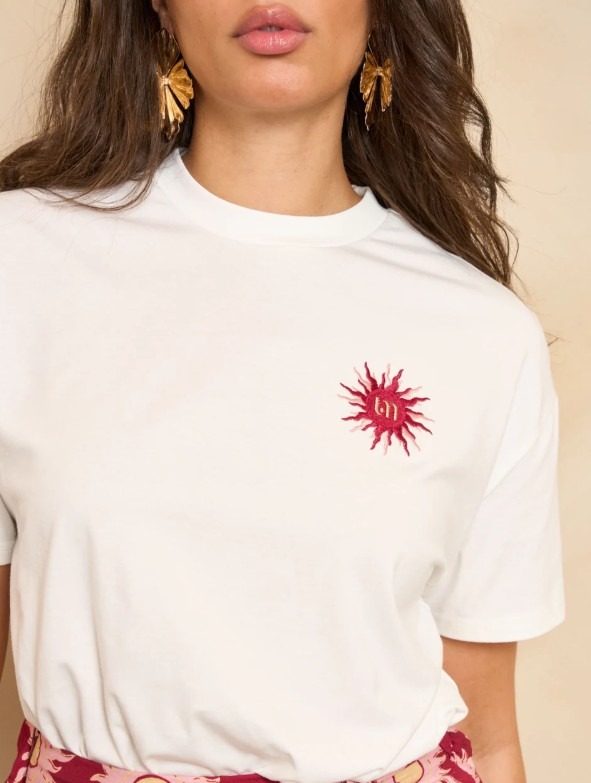 T-shirt Tiva is een wit oversized T-shirt met een comfortabele fit. De ronde hals en het geborduurde artwork op de voor- en achterkant geven een stoere touch. Ideaal voor een casual look met karakter.