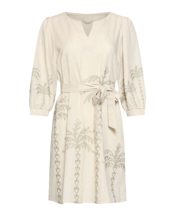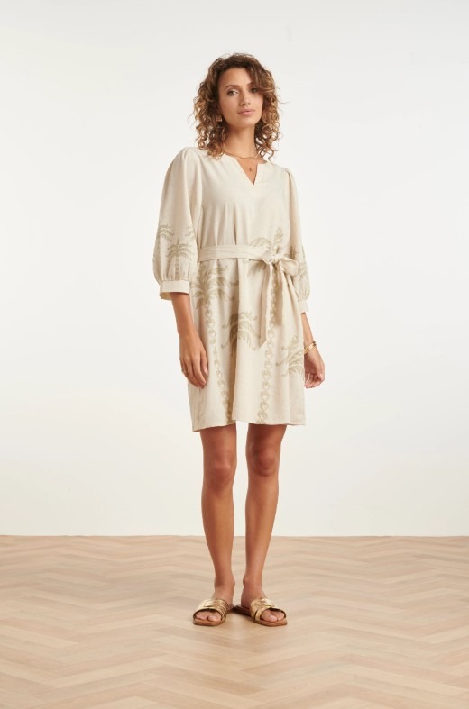Met deze jurk van Smashed Lemon ben je in één keer klaar voor een zomerse dag. De jurk heeft een natuurlijke zandkleur en een luxe linnen-look die perfect past bij het warme seizoen. Wat deze jurk echt uniek maakt, is de geborduurde print van palmbomen die over het hele item loopt. Dankzij het bijpassende strikceintuur kun je de jurk mooi in de taille knopen voor een vrouwelijk silhouet. De elegante V-hals en de driekwart mouwen maken dit ontwerp van Smashed Lemon tot een tijdloze favoriet voor elke vakantie of zonnige middag
