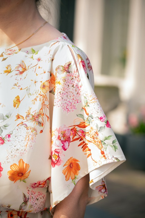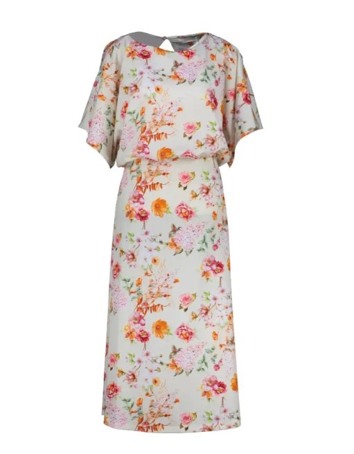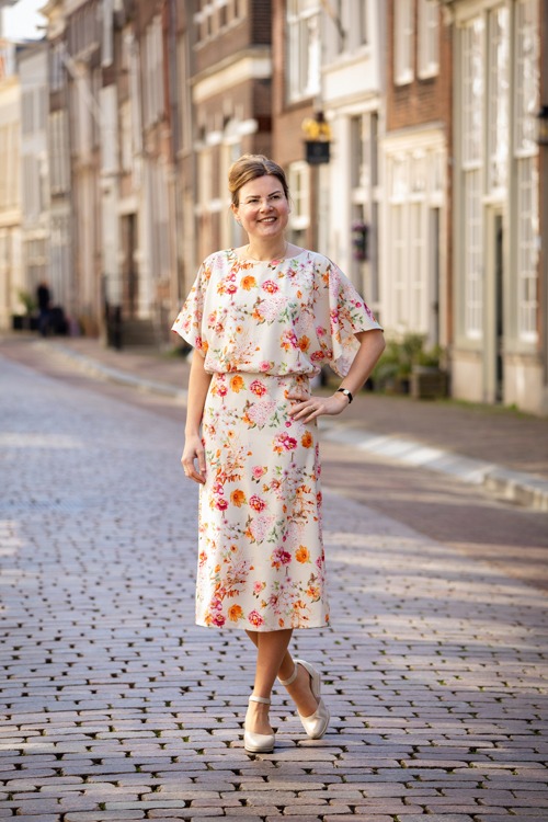 Deze jurk van Amelie & Amelie heeft een allover bloemprint, de jurk heeft een gebloesde taille, wijde mouwen, split aan de zijkant en knoopsluiting aan de achterkant.